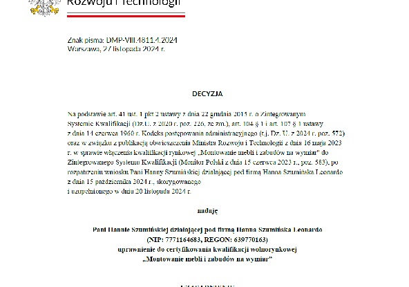 - Decyzja Ministra Rozwoju i Technologii z 27.11.2024r.o nadaniu uprawnień Instytucji Certyfikującej Pani Hannie Szumińskiej działającej pod firmą Hanna Szumińska Leonardo (NIP: 7771164683, REGON: 639770163) do certyfikowania kwalifikacji wolnorynkowej